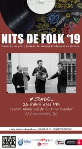 Des de l’entitat us volem presentar un nou projecte que es va crear amb l’intenció d’expandir el festival Folk ‘n’ viu, en la seva tercera edició. Les Nits de folk són concert en petit format de música tradicional en acústic i en directe. Donem el tret de sortida amb el grup Mirabèl, amb una actuació al Centre Municipal de Cultura Popular de Sant Andreu el dia 26 d’abril a les 19h.