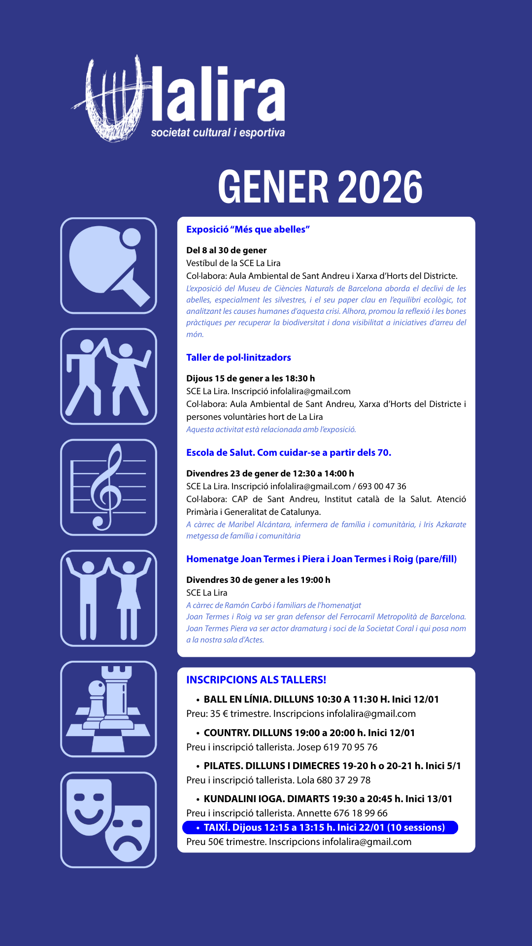 PROGRAMACIÓ GENER 2026By SCE La Lira|2025-12-22T17:38:37+01:0022 desembre, 2025|Activitats, General|0 ComentarisShare This Story, Choose Your Platform!FacebookXRedditLinkedInWhatsAppTumblrPinterestVkXingEmail: Llocs relacionatsAlmanac Fragmentat – Volum 2026 OFERTA DE FEINA! Tècnic/a de comunicació Bones Festes i Feliç 2026 3, 2, 1… ZERO. Contra la violència de gènere