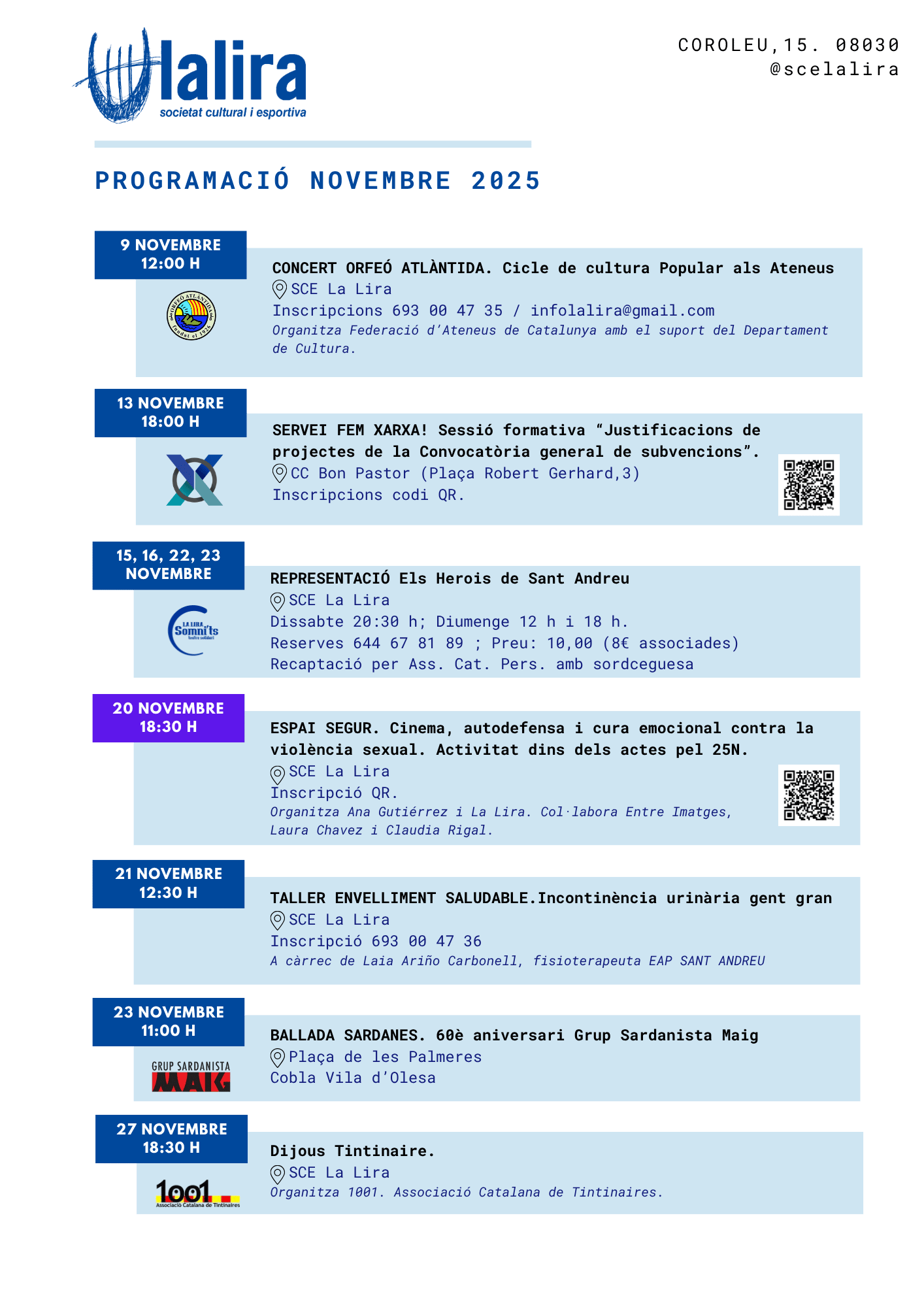 PROGRAMACIÓ NOVEMBRE 2025By SCE La Lira|2025-11-05T16:28:38+01:005 novembre, 2025|Activitats, General|0 ComentarisShare This Story, Choose Your Platform!FacebookXRedditLinkedInWhatsAppTumblrPinterestVkXingEmail: Llocs relacionatsTardor Solidària 2025 PROGRAMACIÓ OCTUBRE 2025 Ja és aquí el Cicle de Cultura Popular als Ateneus 2025 PROGRAMACIÓ SETEMBRE 2025